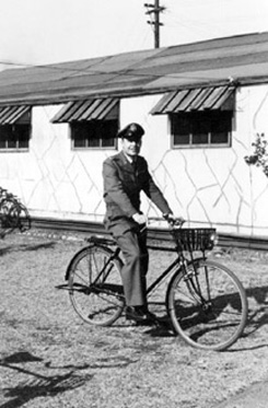 One of the first facts of life that became obvious was the need for personal transportation on base and out into the local community nearby. After some preliminary checking, members of our crew that wanted bikes went out as a group to negotiate a selection and price. We found a nearby bikeshop, and here you see the dealer, his staff and shop, after the deal had been struck and then Chuck astride his new bike.