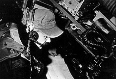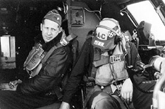 Lower Left: Bob Weisburn, Photo Navigator, fulfills a variety of roles, depending upon the mission. In every case he assists with navigation, keeps a sharp eye forward, is always available to operate the forward gun system and assists crew coordination.