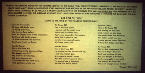 Lt. William McCrystal, assigned to the 80th Fighter Squadron, Itazuki AB, Japan, composed the song. His assigned aircraft was P-51D, # 44-73801. I know of no verses that cannot be sung in mixed company.