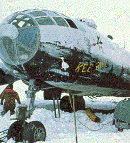 Weather is now the main concern, a month has passed and it is now the second week in August. Ominous clouds are all around. The wind is increasing. Rick continues the never ending work even in the rain. Darryl is desperate to keep the shuttle flights going as weather is coming on fast. The work is physically demanding. The bomb bay doors now work. Wheel bearings, brakes, and the entire hydraulic system required maintenance. Rick appeared exhausted and showed strain from the constant hard work. The massive rudder and elevators now work. The huge props are sixteen feet across and each weighs almost a ton. They too are finally installed. It is now time to start an engine. It refuses to start. After Rick makes an adjustment to the carburetor it finally starts and runs, music to their ears. Time is running out. The runway is not ready. It is August 22 and winter is rushing in. All four engines are now running, a magnificent sight. Rick rechecked everything and fixed the many oil leaks. The Caribou left for Thule to get gas for the Kee Bird. Rick suddenly became ill and was working with great pain. He finally collapsed, the end of his working on the Kee Bird. The Caribou returned from Thule with a very serious problem in the right engine. An exhaust valve was stuck and a new cylinder was needed. The problems were mounting fast. Winter hit with all it’s fury, gale force winds and freezing rain. If they don’t get out now they never will. Heavy snow is settling on the camp and visibility is poor. The previous two months has taken it’s toll on everyone. Now everybody is working on the Caribou. It is their lifeline, the only way out. The engine has a serious oil leak and the plane is covered with ice. It is a flying death trap. With a snow covered makeshift runway and Rick very sick they all climb into the Caribou and leave. On the way back to Thule the Caribou lost the right engine and struggled back on one. They made it, and Rick was loaded into an ambulance and taken to a hospital in Canada. He died from internal bleeding and a blood clot. He had literally worked himself to death. Darryl understandably was visibly upset, but he had no intentions of quitting. Nine months later the Caribou was still out of service. The crew returned to the Kee Bird in an airplane equipped with Skis. Darryl had hired some new competent crew members. The temperature never got above 24 degrees making the work most difficult. Darryl figured in two weeks they could check everything out and get the Kee Bird in the air. All the oil leaks were fixed, all engines were running good. The instruments were all reading O.K. Darryl figured it was now or never. The unfinished runway was covered with heavy snowdrifts, so Darryl decided to take off across the frozen lake. The flight engineer reported oil pressure O.K. Darryl had installed a new Satellite Navigational System. He was ready to go. Maximum power was applied to break the Kee Bird loose from the snow embankments. Darryl made a circle positioning the plane at the beginning of the take off point. Just as he is about to apply full power for take off thick black smoke pours out the cockpit window and immediately the plane is totally engulfed in flames. Apparently a fuel tank broke loose and dumped gas on the APU which was running. The crew was fortunate to get out alive, in seconds the Kee Bird was consumed by fire. The years of planning, hard work by so many, Rick gave his life, and they were so close. The Kee Bird was ready to fly, with success only seconds away. All they could do was sit there and watch their beloved project burn to the ground. When summer rolled around the remains of the Kee Bird along with the four new engines sank to the bottom of the lake, there to remain forever. You can purchase the tape capturing these events as they happened from Amazon.Com. Listed as “B-29, Frozen in Time”. It is a must see. End of Page 9 Go to Short Story Listing or 06 07 08 09 10 11 12 13 of Short Stories Home - Contact Us - Cold War Hist. - 91st SRS Hist. - Stardust 40 Mission Story |