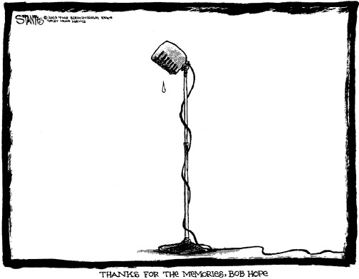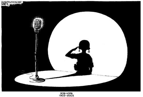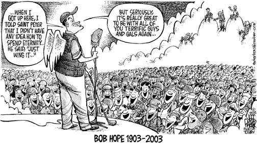 As happens so often, one of our web-site visitors has passed a collection of Bob Hope Memorial Cartoons on to us. Reviewing this material has brought the life work of Bob Hope into clear focus for me. It has also sharpened my appreciation for the cartoonists who give us such moving perspectives on life through their genius as presented through the various media.