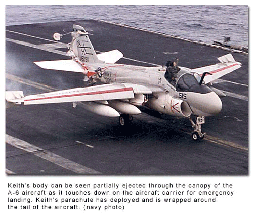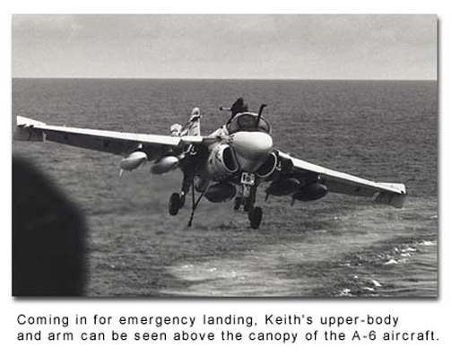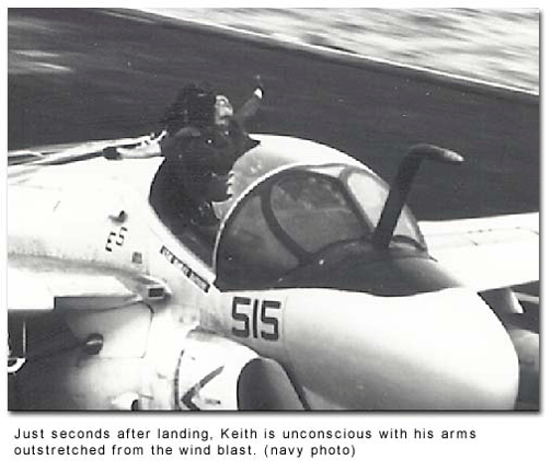I wish I could say that my last thoughts were of my wife, but as I felt myself blacking out, all I said was, "I don't want to die." (Close up of Keith just after landing.) Someone turned on the lights and I had a funny view of the front end of an A-6, with jagged plexiglas where my half of the canopy was supposed to be. Looking down from the top of the jet, I was surprised to find the plane stopped on the flight deck with about 100 people looking up at me. (I guess I was surprised because I had expected to see the pearly gates and some dead relatives.)
