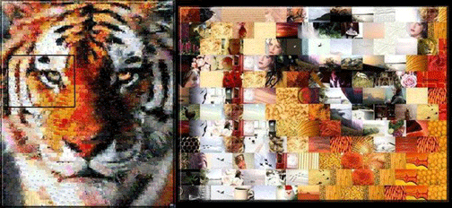 Here is one I did of a tiger, showing the mosaic, and a close-up of it where you can see what the individual pictures are. And then a second picture showing how it looks hanging in a room.