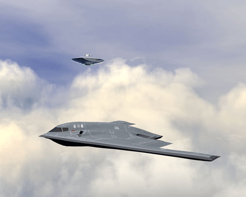 This is the famous McPherson photograph taken by the chase plane during a shake-down flight of the B-2. The pilot of the chase plane saw an object flying at the same speed of the B-2, and managed to take this picture. Moments later, the object flew off to the southeast at an enormous rate of speed. It was not known just how close this object was to the B-2 until the photograph revealed the reflection of the B-2's wing on the underside of the craft. Interestingly, neither the B-2 nor the mystery craft appeared on military radar.