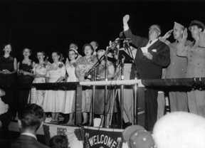 When we reached the reviewing stand, I saw it was already occupied by the members of my family, city officials, and a guest speaker. Here the procession was momentarily halted while I was directed to a seat on the stand from which I reviewed the most spectacular parade I've ever seen. After the parade had passed, I looked out over the crowd of people, many of whom had been standing along the line of march and then followed to the stand. | |||||||||||