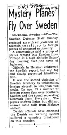 They could only make passes from either side of a greater than 45 degree angle. Later, after we were hit in the left wing and fuselage, one MIG tried to ram us by side slipping his fighter into our aircraft. On one “ramming” pass he stalled out right under our aircraft and our vertical camera took one of the first close-up pictures of the new MIG-17. (The Intelligence community was elated at the picture!) As we coasted out of Finland one of the remaining fighter pilots flew up to our right wing, gave us a salute, and then turned back toward the Soviet Union. Having flown combat in WW2 and later recalled during the Korean War, I thought we were in a Cold War with Russia, not a hot one, since all the Reconnaissance plane “shoot downs” had been kept very secret. During our de-briefing with General LeMay, I said to him, very innocently, “Sir, they were trying to shoot us down!” Smoking his usual long cigar he paused, leaned back and said “What did you think they would do, give you an Ice Cream Cone?” His aids all smiled, but I was serious. End of this story This is page three of a three page document. Click one of the selections below to move on. Home - Contact Us - Cold War Hist. - 91st SRS Hist. - Stardust 40 Mission Story |