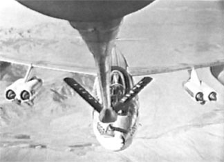 In all of my nine years of flying up to that time, I was never more thrilled to see another airplane in the air than I was to see that beautiful KC-97 that day. I saw Rigley’s airplane and headed for it. We had already decided to land if need be at Brize Norton, and were letting down to do just that. Holt said, “We’re going to run out of gas.” Rigley had his guys looking up for us and caught a glimpse of what they thought was our airplane and leveled off at 3,000 feet heading south. I circled once letting down. As we maneuvered and pulled into contact position, Holt said, | ||||||||||||||