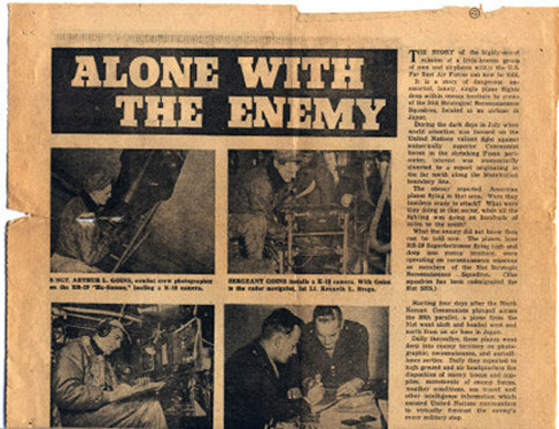 It is a story of dangerous unescorted, lonely, single plane flights deep within enemy territory by crews of the 31st Strategic Reconnaissance Squadron, located at an airbase in Japan. During the dark days in July, when world attention was focused on the United Nations valiant fight against numerically superior Communist forces in the shrinking Pusan perimeter, interest was momentarily diverted to a report originating in the far north along the Manchurian boundary line. The enemy reported American planes flying in that area. Were they bombers ready to attack? What were they doing in that sector, when all the fighting was going on hundreds of miles to the south? What the ememy did not know then can be told now. The planes, lone RB-29 Superfortresses flying high and deep into enemy territory, were operating on reconnaissance missions as members of the 31st Strategic Reconnaissance Squadron. (The squadron has been redesignated the 91st SRS) Story continues below illustrations |