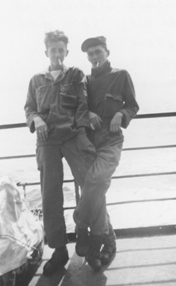 Within minutes of his remark, he just made it to the ship’s railing before he began his descent into hell. When he finished and looked back to us for a little sympathy, we all laughed and pointed are fingers at him. “#%*$ you guys; you’ll get yours,” he moaned as he turned toward the railing again. “There are two things to do to keep from getting sick: stay topside as long as possible and eat every meal,” said the voice of authority whose name I’ve forgotten over the years. Maybe it was Archie. He was always making pronouncements. Bill Schuster, Don Nolan, Bob Wolfington, Bill Sutton, and I took it as gospel. The only one of the group to seriously succumb to motion sickness was Bill Sutton. He would faithfully eat every meal and, just as faithfully, he would find himself bending over the rail. Nary a man was more faithful to Archie’s admonition than Bill Sutton. It just didn’t work for him. He took his poison like a man. Never complained. He would position himself against some pole or bulkhead, pull his poncho over his head, and stay there until it was time to eat again. We all admired his constancy. Bill Schuster had a short bout with barfing as did Don Nolan but Bob Wolfington and I never did. To this day, I can’t understand why I escaped. The only time I came close to letting go was when the guy in front of me in the chow line barfed in his tray. For a split second, I thought “this is it.” But, the Fates were with me and I managed to keep things down. |