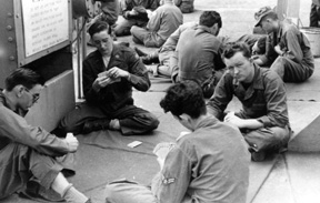 It was a long trip (17 days) in rough seas. We passed time creating and spreading rumours. Lots of the guys bit into the rumour that there would be a mail plane meeting us at the half-way point in our journey. Two or three V.D. lectures scared the hell out of all the younger guys. Snoozing on deck and watching an occasional movie helped morale. But it was the card games that provided the biggest diversion. Poker was out as everyone was broke so pinochle was king; and all the pinochle games were crooked. Guys developed elaborate signals to communicate the contents of their hands. Don Nolan and I were partners and had developed a fairly sophisticated set of signals. While in a game with Archie Gainey and his partner one afternoon, Archie accused us of cheating. I don’t know how you are doing it, but if you little bastards “hit” each other’s cards in the next hand, I’ll throw these #%*$ing cards overboard. That’s exactly what he did as Don and I “hit” each other in the same suit the very next hand. We got on Archie’s case for a couple of minutes, accusing him of being a “poor sport” and denying that we cheated. He just stared at us for a minute, a big grin spreading across his face and “flipped us the bird.” Everyone laughed and so did we. Life went on. |