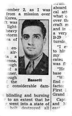 Captain Bassett of Hastings Gets Home It’s a small world, is the conclusion of Captain John K. Bassett of the Unites States Air Force who is flying bombing missions over Korea. In a letter to the Tribune relating an unusual experience, Captain Bassett of Hastings writes: On November 2, as I was returning from a mission over North Korea, my aircraft was struck by lightning in a heavy thunderstorm over the Sea of Japan. |