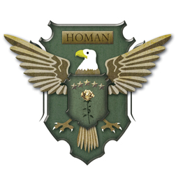 (Michael's son and Elvin's grandson) designed this Homan Crest for our family: • The HOMAN at the top represents our family. • The Camouflage Green Eagle represents my Dad, Elvin the protector of the family and is the symbol for the military that we serve. • The single yellow rose in the center of the crest, represents my Mom, Rosa the heart of the family. |