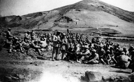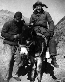 February 4: Up at 9 AM (Sunday). Washed, brushed teeth for first time (with face powder). Big breakfast (eggs, chicken, soup, etc.). Started out at 11:05 and arrived at 1:30 covering about seven miles. Fine trip - good donkey almost my size. Four PM - hungry, no food yet. Washed feet and they are washig our socks. Had tea again. Drink it fifty times a day and it is the same as hot water (if you see a few leaves in it, you know it is tea). Traded knife to commander for Jap flag. Spent last night 1 1/2 miles from the enemy. Everyone OK - sprained ankles improving.
