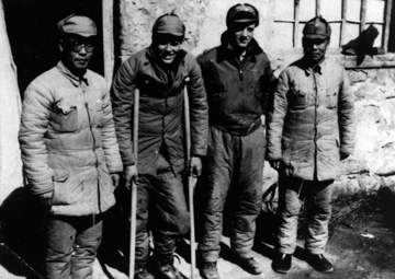 February 3: Cold sleeping last night. Had feast about 10 AM. Injured are no worse. Sent our names and serial numbers to Yenan (Guerrilla Headquarters). Think we have about eight hundred miles to go. They say we will make it in six weeks but I doubt it. Traded flying helmet for Chinese hat as did some of the others. Chinese hats cover our ears. Wonder if squadron, folks, Bette know our predicament. Interpreter was a Korean student in Tokyo - saw Doolittle raid on Japan. Sent to Manchuria as Jap soldier and escaped. His name is Wong. Had huge feast at three o’clock. Wine very strong. Sweet spuds, best I ever tasted. Women and children representatives appeared with note (brave airman who crossed ocean to fight for China, etc.). Gifts of fruit, cookies, etc. Girl gave speech and two interpreters translated it. We gave thank you note. Four kids sang song. Commander gave us 100 cigarettes each (local stuff). Children gave us tooth brushes and face powder for teeth. Got towels, soap, Chinese overcoats. Escort company of 300 stood at attention and bugle was blown as we lined up in front on donkeys. Some will escort us to Yenan. Rode donkey from 5:30 PM till midnight through Jap lines - cold as hell - temperature around zero - thought I’d never make it. Towels around neck (our breath froze to ice on towels) - feet froze solid. We are up in high mountains. Frequent stops for investigation (to inquire of Jap positions). Claim we went ten miles but it seemed like a hundred. Ate eggs, soup, tea, peanuts - to bed at 2 AM.