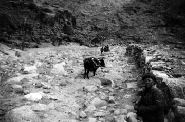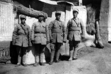 Barber shaves forehead, ears, etc. Second party arrived at 4 PM. The deal is all messed up. Morrison still can’t travel so he, Double and Mr. Lee will stay here (3 days from Fouping). He can move in about a week. Fellows are real sore because they held us up. Carnicelli, Osterhouse and Kelsey will go on with us. Double did not send our departure message so we will send one from here through Fouping. Bed at 9. March 28: Up at 8 - 55 days since we bailed out. Off at 9:30 and saw lots of block houses and one destroyed Jap block house. Saw Great Wall of China all day. Had not seen it since back near Peiping two months ago. Saw wounded Jap prisoner on road - he was taken with Block house the other day. It and the Japs are ten miles from where we are staying tonight. Walked better than half of the 65 Li today. It rained twice but not for long. Easy trip. Four bunks - plenty of room but it is solid concrete. It looks as though we are really on the move now. Taped right foot and it was OK. Slight cold - lip healing OK. Took pictures of the Great Wall and Block Houses. Left Shorty, our favorite orderly, behind. Ate at 7. Chinese captured Jap airfield near here and now suggest we try for plane again but we refused. After supper Chinese heard that Japs reinforced Block House ahead by 100 Japs so we will leave again at midnight for 70 more Li to throw them off. Slept from 8:30 till 11:30. March 29: Off at 12:15 midnight after three bowls of millet. Full moon - moved fast - mostly all level - easy travelling. Saw flares and heard explosions but that is all we know. Crossed Wooto River with two others on mule with me - soldiers waded across. Passed five Li (1-1/2 miles) from the Japs. Got very cold and we could not ride more than a half hour at a time or we would freeze. Had 400 - 500 soldiers with us - dangerous country. Just at dawn saw full moon and full son in sky at same time. Stopped once for land-mine scare. Could smoke only near the end of the journey. Arrived 7:30 AM - very tired. Dozed from 8:30 to 10:30 AM then ate. Country here is like Wyoming and Arizona. Can’t unpack blankets - Japs seven miles away. Off at 12:15 noon - slow travel over mountains and did 35 Li by 5:30 PM. Everyone dead tired. Hit sack immediately. Up at 9:30 for chow and then back to bed. For first time the people raised hell about us taking their house. With the Jap danger, poor food and rough terrain, some think we should have stayed at Fouping and sweated out a plane.
