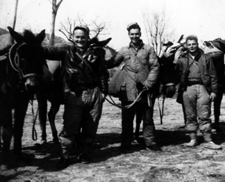 Stopped for tea after 20 minutes, rode on and off till 7 PM then dismounted and walked for next 7-1/2 hours over mountains, snow, through rivers, etc. Overcast so we couldn’t see - got lost. Fell over cliff and was saved by donkey tail. Crossed railroad under bridge at 2:15 AM and everyone would have liked to blow up the bridge. Saw guerrilla stealing wire and sawing down pole. Rode all night - lost again. Got real cold about 4 AM - crossing road after dawn and saw Jap strong point and block house. Two fellows had runs all night and I am getting them now. Stopped at 11 - slept two hours - ate rice and spuds - (first meal in 24 hours) - off again at three - rode till 7:30 PM. Had tea, bullion, washed, slept from 8:30 till 11 PM then ate supper, a pretty good meal. To bed at 11:30. Found out that five Chinese guards led us across railroad - they had been put there by the Japs. Japs have best chance of catching us crossing railroads and rivers.