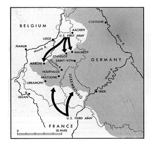 The Bulge was what Americans called a 50-mile wedge the Germans drove into their lines in December of 1944. Just when the U.S. First Army had been lulled into a false sense of security, Hitler struck through the fog-clouded Ardennes with most of his remaining armored reserves, gambling on capturing sufficient gasonline to gain Liege and Antwerp. He ordered three of von Rundstedts armies the Seventh, and the Fifth and Sixth Panzers (ten tank divisions, 14 infantry) to attack on Dec. 16 over a 75-mile front which was held by only five U.S. divisions. |