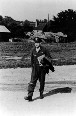 Captain Norman Arvidson walks from quarters to truck that will carry him and his crew out to the flight line as they prepare to launch the invasion of Europe.