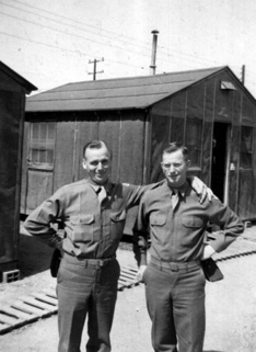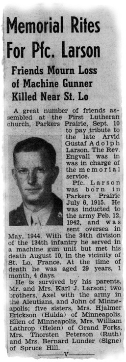 Arvid Larson, from Parkers Prairie, MN, and a good friend, was killed across a nearby road from me in the combat area. Arvid and I, members of the same platoon, had visited just three days earlier, before I was wounded, and I had encountered him once again on the day he was killed. Gene Nelson (L) and Arvid Larson (R)