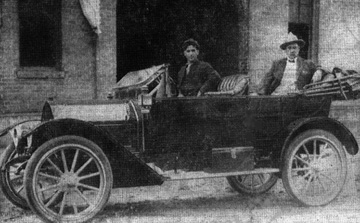 The Milkman cometh Ready with his quart measure to deliver milk from the can he carries, Franklin Farrow represents his Lone Pine Dairy. Often in the winter, the measure had to be defrosted, lest a customer receive less than a full quart because of frozen milk at the bottom. Behind the dirt street and board walk is the Midland Hotel, later converted into the Sallden apartments on Broadway east. A livery business came next in a fine brick building where he often had as many as 60 horses to rent out. Altered considerably in recent years, the building is still used by the Nate Dinner business. Many were the trips which the Farrow rigs took around the county. It took two days then to drive to Mille Lacs, with a half-way stop at Ruckers farm, where the old house may still be seen if one knows where to look. Besides the brick building, there was the red barn, located where Dr. Goblirsch now has his dwelling and office. Still another building, in the Lang Ford Co. location, was added in that momentous era when cars began to replace horses in the transportation business. In 1907 Mr. Farrow bought an old chain-drive Reo the third car in Morrison county and the first of many which he was to put into use.