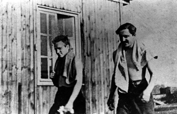 After Easter, April 1, 1945, kriegie (Kriegsgefangen - prisoner of war) life was going very well and with warm sunny days it made us all feel better. The boxer, Max Schmeling, visited that day. Joe went to see him and stated he was a big joker. When we woke very early on April 4, the mess hall was on fire. |
