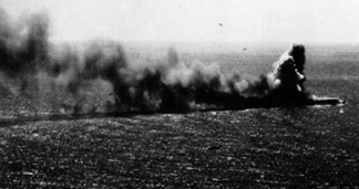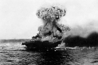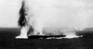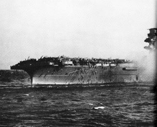 Below: The “Lexington” survived torpedo hits but an hour later suffered a fatal series of explosions when gasoline vapor ignited between decks. When “Lady Lex” went down her survivors wept. |