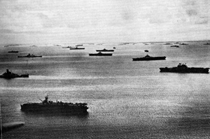 June 7, 1944: The U.S. battle fleet of several hundred assorted warships, all under command of Admiral Raymond A. Spruance, is divided into two parts: the invasion force, composed of battleships, cruisers, destroyers and troop transports containing marines and soldiers, and the fast carrier task force, known as Task Force 58, under Mitscher. It is D-day minus 8 and Task Force 58 moves westward. |