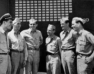During the biggest aerial battle in history, our ready rooms were emptier than usual but otherwise no different from other days. Coming back from strikes, the pilots usually stopped to have a drink of pineapple juice or a sandwich at the canteen just outside the door. Then they came in, took a look at the score chalked upon a blackboard and gave a brief version of their activities to one of the intelligence officers who were trying to keep track of what was going on outside. |