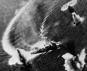 The destruction of the first two planes was spectacular enough but the end of the third, which followed about a minute later, might have been designed in Hollywood. This time the Japanese, another dive bomber, came in toward us on our starboard beam. Both ships on that side of us began firing simultaneously in two long needles of tracer bullets. For a moment the plane seemed to be held up by a delicate pair of tongs. Then suddenly, without warning of smoke or flame, it exploded in a bright flash and fell in three pieces. |