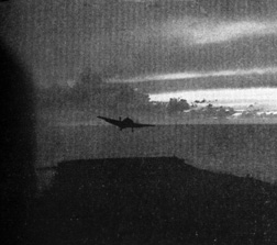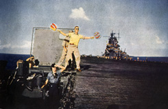 Tonight as the ring of planes circling our deck grew larger and larger, everyone on the ship knew that all of the planes in the circle were down to their last few drops of gasoline. The great hazard of night landings is a deck crash which interrupts the rhythm of the landing intervals. Our first half-dozen planes landed safely. The seventh was a visitor from another ship on such occasions pilots are ordered to land on the first carrier they spy and our deck, being bigger than most, attracted more such guests than any other. This pilot came in high. The signalman on the stern gave him a wave-off, i.e. a signal instructing him not to land. Because he was wounded, out of gas and dead tired, the pilot ignored it and cut his motor a moment later than he should have. The plane consequently missed the cables. |