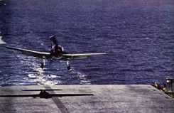 A Hellcat fighter comes in to land. The pilot has throttled back his engine and extended wing flaps in order to slow down. His hook trails behind, ready to engage one of the wires strung across the deck. |