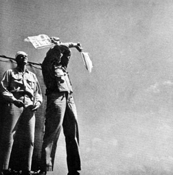 Before landing on a carrier, planes circle the ship and come in low over the stern where an extremely responsible officer directs them with two small, brightly painted paddles, which he holds in outstretched hands. At a certain point, the landing signal officer makes a gesture which tells the pilot to cut off his motor. It is a cardinal rule of carriers that the pilot obey instantly. His plane then drops to the deck where a hook affixed under its tail catches one of several cables stretched across the deck, bringing it to an abrupt stop. Deck hands disengage the cable, the plane taxies toward the bow and, as it does so, the signal officer on the stern flags in another one. |