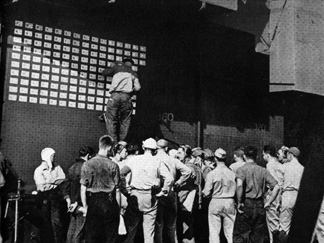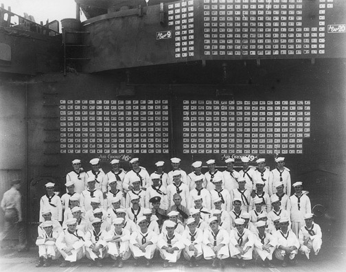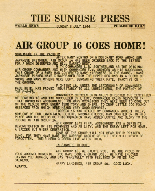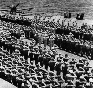 This afternoon, burial services were held for the two men killed in the night-landing crash. On the empty flight deck, target of so many Japanese bombers, scene of so many daring departures and hairbreadth returns in the last few days, the entire ship’s company lined up. The small, quiet bodies of the two men, wrapped in flags, were brought up to its level on the huge, high-speed elevator. The bugler who sounds reveille through an amplifying system stood out in the open to blow taps. The bodies slid into the sea. | ||||||||||||||||