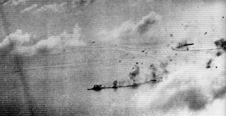 June 21: This morning a destroyer picked up a pilot named Warren E. McLellan, whose experience was certainly one of the strangest as well as one of the most valuable of the whole war. Piloting one of our torpedo bombers, McLellan found his plane, hit by Japanese antiaircraft fire, on fire about 5,000 feet above the target. He and his crewmen bailed out and floated down safely through the hail of fire, presumably because the Japanese gunners were too busy with our other planes to bother with them. McLellan hit the water in the midst of the enemy fleet. From his point of vantage he was in a position to ascertain exactly what damage our bombers had done. McLellan and his crewmen watched Japanese rescue boats scour the sea by searchlight for survivors. When the fleet moved on he as attacked by sharks which he clubbed with his shoes. Today a search plane dropped him a raft, and finally, 14 hours after his jump, a destroyer picked him up. |