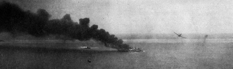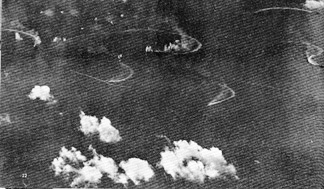 raiders at Kwajalein is burning. Both were hit. Bright flame aft may be only a signal light. This photo was taken by McLellan’s Torpedo Bomber crew at point of torpedo release. Below: “A dive bomber’s paradise and a Japanaese hell” was a pilot’s description of December 4, 1943 raid on Kwajalein. A cargo ship is burning. |