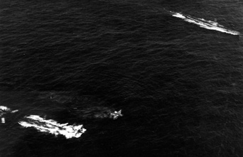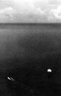 On the attack on Palau Island, on a glide bombing run, my plane was hit in the engine as I dropped my bombs. I was able to get halfway back to the carrier but was advised by those flying wing on me to land before the engine quit or caught fire. I have a picture taken from a rescue plane showing my landing in the water. The picture shows a rescue submarine in the upper right comer and a rescue plane landing to pick up my crew and me. We were back in the air in 10 minutes and on our way back to the USS Wichita. It took another week before they transferred me back to the Lexington. |