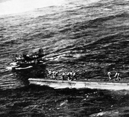 Left: McLellan crew makes water landing with engine failure imminent. The splash of the touchdown on the water is seen on the right, the rescue submarine is on the left. Above: Rescue Submarine on guard, above right. Torpedo Bomber visible floating in water. Rescue SOC Seaplane, lower left, picking up crew. |