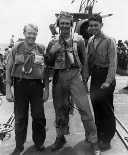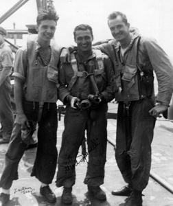 seaplane in a rescue mission in another battle. Above: Rescue pilot, Mike Spinelli (center), fellow crew member “Izzy” Zautner (left), and Warren McLellan aboard USS Wichita, March 30, 1944. Left: McLellan’s two rescued crew members, John “Hutch” Hutchinson (L) and Selbie Greenhalgh, with rescue pilot, Jim Alcock (C) |