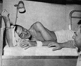 The next day my squadron came over me about 10:00 a.m. I pulled a dye marker to color the water around me and they dropped me and each of my two crewman a lifeboat. I crawled into my boat, covered up with a sail included in the boat, and went to sleep. About 4:00 p.m., a U.S. fighter plane buzzed the boat and woke me up, and a sea plane landed and picked me up. This was my own squadron coming back to find us. I saw my crewmen in another sea plane and that was the first glimpse I had of them and now I really knew that they were alive. We had been in the water about 22 hours.