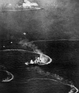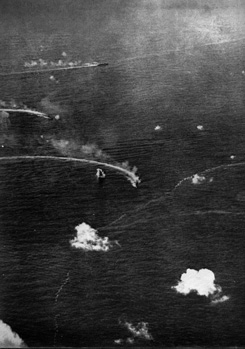 a portion of the Japanese pauses in flight to writhe and twist under American attack. The carrier at above right is taking many hits. |