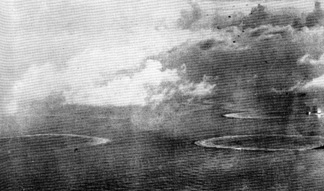 Below: Heavy cruiser (right) completes frantic circle to escape planes. Flashes above cruiser are bomb hits on carrier and battleship narrowly averting collision. |