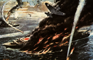Now reality began to set in. As we started our dive at a little after 7:00 pm we could still see the sun low in the horizon to the west. When we completed our dive at that lower altitude it was dusk and the sun had disappeared on the horizon. This was both bad and good. Good from the standpoint that the gunners on the ships would have greater difficulty picking us up in their sites but bad from the standpoint that when we got clear of the enemy task force we had to try to find each other and start back to our own ship. The intent of every pilot that ever bombed a ship is to get as far away from that ship as quickly as possible. They just do not like to have you bomb their ships. My crew was well aware that my next move would be to get as close to the surface of the water as possible and the sooner the better. Our next goal would be to thread our way out through the other ships in the enemy TF and out of the reach of their guns. This is accomplished with some rather violent changes of direction at a very low altitude and with the throttle as far forward as you can push it. For these few minutes you really do not spend a lot of time thinking about conserving your fuel. My crew and I do not believe we took any appreciable enemy fire during our dive. We do believe however, that on our way out of the enemy TF we did take some fire. It did occur to me shortly after the dive that the bombay doors might still be open. I had pushed the lever that should have closed the doors but a red light on the instrument panel indicated that they were in the open position. Within a few minutes (which seemed like an eternity) we were outside of the destroyer screen of the enemy force and looking for our friends. We found Sterrie and Swanson at about 1000 feet circling and waiting for us and the other planes. Soon Cushman and Thomas joined us and the five planes headed out on a course that Sterrie had plotted while he waited for the rest of us to join him. Chapter 3 End of Page 4 of 7 Pages Go to Page 5 Page 1 2 3 4 5 6 7 Or This Story’s Cover Page Editor’s Introduction Table of Contents Fred Gwynn’s “Torpedo 16” Chapter 1 2 3 4 Or Home - Contact Us - Cold War Hist. - 91st SRS Hist. - Stardust 40 Mission Story |