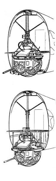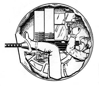 Lower Ball Turrets Reed Holden’s office work-space was the lower ball turret on a B-17 Bomber. For those who are less familiar with this work environment, I have found drawings of the lower ball turret of a B-24 of the same vintage. The ball turret gunner did not remain in this position throughout the mission. He had a location in the aft section of the B-17 or B-24 where he could ride with safety belt protection during take-offs, landings, and while airborne enroute-to and returning-from enemy territory. When the enemy threatened, he would move into his position. Right: The B-24’s ball turret shown in the Below: Ball turret with gunner in place, with |