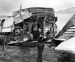 When the fighters backed off, the Brunswick “AAA” took over. I can remember hearing other crew members talking about the flak being so thick “you could walk on it” and I found out the hard way what they meant. Suddenly I felt the plane shudder when we were hit, but we were still maintaining level flight. I heard the turret’s electric motors winding down so I shoved the handle forward to rotate the turret. Thank the Lord there was enough power left so I could get the turret lined up in order to open the hatch and squeeze out. When I emerged from the turret, I was greeted by a raging inferno so hot the flames were white. As I put on my parachute I thought, “wait until the pilot sees this”. I was standing in the radio room facing the rear of the plane and as I looked down to my left, I could see where the bullets had torn a triangular hole in the fuselage of the plane. I pushed on the metal and managed to make a hole large enough for me to get through with my parachute on. I took a step backward and felt a piece of burning metal fall on me. I looked out the hole a second time and I heard the Lord say, “Holden get the Hell out of here, enough is enough” and I was out of the plane. |