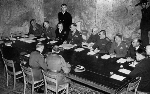 High Command receives Germany’s unconditional surrender. Photo and text ctsy. Life’s Picture History of WW II, Time Inc. 1950 Editor’s Note: Surrender of an absolutely beaten Germany was signed at 2:41 a.m. on May 7, 1945 at General Eisenhower’s headquarters in the technical college at Rheims, France. Fighting in Europe ended the next midnight. The final collapse had begun in the West on April 29: a million demoralized men gave up in Italy, 400,000 in Bavaria, another million in the Hamburg area. On May 4 word reached Eisenhower from Flensburg, where Grand Admiral Doenitz had set up the government authorized in Hitler’s last testament, that Admiral Hans Georg Friedeburg, the new head of the German navy, was on the way to Allied headquarters to negotiate surrender. At first the Germans insisted on surrendering only to the Western Allies. But General Eisenhower sent word that nothing less than unconditional surrender to all the Allies, including the Russians, would be accepted. Finally, at a long wooden table in the bare, map plastered war room of Allied headquarters, the unconditional documents were signed. Then Doenitz’ representative, Colonel General Jodl, was taken into Eisenhower’s office and charged with the responsibility for carrying out the terms. At Russian headquarters in Berlin 45 hours later the ceremonies were repeated. |