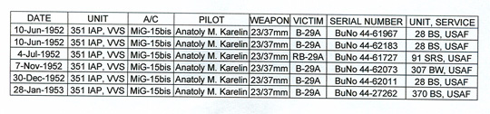 ...around midnight in the night of July 3-4 1952 again Major Anatoly Karelin-flying this time the MiG-15bis Fagot "300"- blasted out of the sky the RB-29A BuNo 44-61727 of the 91st SRS with 37 and 23 mm shells. 11 out of the 13 crewmembers became POW, one was KIA and the remaining one is MIA.