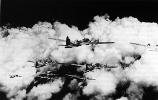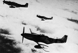 By now we were about ready to turn on the bomb run and the other groups were already on it. From a clear sky, the picture suddenly became flecked with ugly black spots in fact, it seemed to have become filled with them! It was hard to realize that those big black puffs were ugly pieces of jagged, razor-sharp steel shrapnel. And it was equally hard to realize that the pretty puffs of milky-white stuff were in reality the bursts of a phosphorous shell, that would burn any part of a plane that went through it. And all the time, the wonderful P-51's were scooting all over the sky, pouring it to the Japs. |