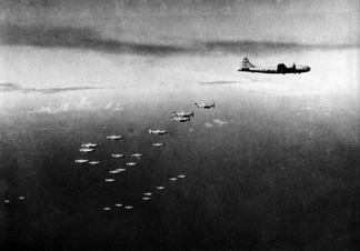 From here on the guns were going all the time and the flak was bursting all the time. Way up in front, a 29 fell below his formation, and 4 P-51's went hurtling down to him he blew up into three flaming sections. After what seemed like years, our bomb doors were opened and finally bombs were away.