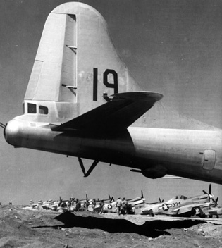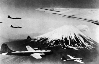 On the way up, we ran through some foul weather, and couldn't even see beyond our wing tips for a long time. Naturally we were apprehensive about the fighters getting through it, as well as our own formations, intact. In fact we were all really doubtful about meeting them at rendezvous anyway. When we finally broke out of the "stuff", we were able to get together, and climbed on up to our bombing altitude which for daytime bombing would make your hair stand on end it was anything but high altitude! By this time the weather had dissipated, and ‘neath a bright sun (what a rarity!) Mt. Fuji could be seen clearly, as well as the saw-toothed mountain ridges running up Honshu's back. We circled, and I have never seen so many 29's before in one place, with different groups and squadrons circling at slightly different altitudes. It was really beautiful after some semblance of order was attained. After one or two circles, the time for the fighters to appear was only moments away. We knew it would be well-nigh suicide to go in at our altitude without them. And no kidding, for wonder of wonders, (just like in the movies), a group of small specks appeared high on the horizon and then more and more. After a heart-stopping thought that they might be Jap fighters, we just knew they were ours. And by golly, when they got closer that wonderful P-51 Mustang silhouette was clearly seen, and let me tell you, I felt like crying for joy! I was really carried away!! They looked so beautiful, carefree, "footloose and fancy free" as they broke into smaller groups and circled about us. Then we turned to go to the spot where we would turn on our bomb run and as the formations of 29's strung out against a beautiful background of snowcapped Fuji and the rest of Honshu, the 51's circled about and soon disappeared ahead towards Fuji and the Big City. |
