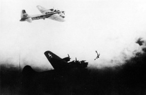 “My God, I can't jump without my parachute. But I can reach down with my left arm and pull the strap up on my shoulder until I'm clear.” Then, “Good Lord, there's no way I can walk halfway across Germany in these felt boots. I'll grab those boot strings with my right hand.” He did exactly as planned, and squirmed out of the escape opening to be thrown clear of the wreckage by the spin of the airplane. There he was, falling rapidly from an altitude the height of which he had no real knowledge because of the confusion caused by the direct hits and bailout procedures that had happened since he had last looked at an altimeter. “I can't get this chute on and buckled with these damn boots in my hand. Hell!, I won't need them if I don't get this chute buckled on.” So he released the boots, struggled into the parachute straps and snapped the buckles closed. When he got ready to deploy his chute he looked up and was surprised to see the boots had been falling with him and were within arm's reach. They were recovered as his thought patterns went like this. “Those German bastards have been strafing our guys when they are hanging defenseless after bailing out. I'll not pull the ripcord until I get into those clouds where they can't see me”. In a moment the vapor of the clouds obscured his vision and he knew no German Fighter was going to butcher him as he came down. But then, “I don't know how close to the ground the clouds are situated -- here goes the rip-cord.” The pop of the parachute opening was just moments before he landed in the middle of what seemed like a clover field. All combat crew members were trained in the procedures to follow if they ever were downed by the enemy. These instructions also followed as thoughts and actions when the pilot landed through the overcast in the field. “Gather up the chute into as small a wad as you can.” He did. He was escorted to the nearest Prison Camp where he spent the rest of his wartime career. End of Page 4, Chapter 4 Go to Page 5 Or you may go to Cover Page Introductions Table of Contents Or you may go to Home - Contact Us - Cold War Hist. - 91st SRS Hist. - Stardust 40 Mission Story |